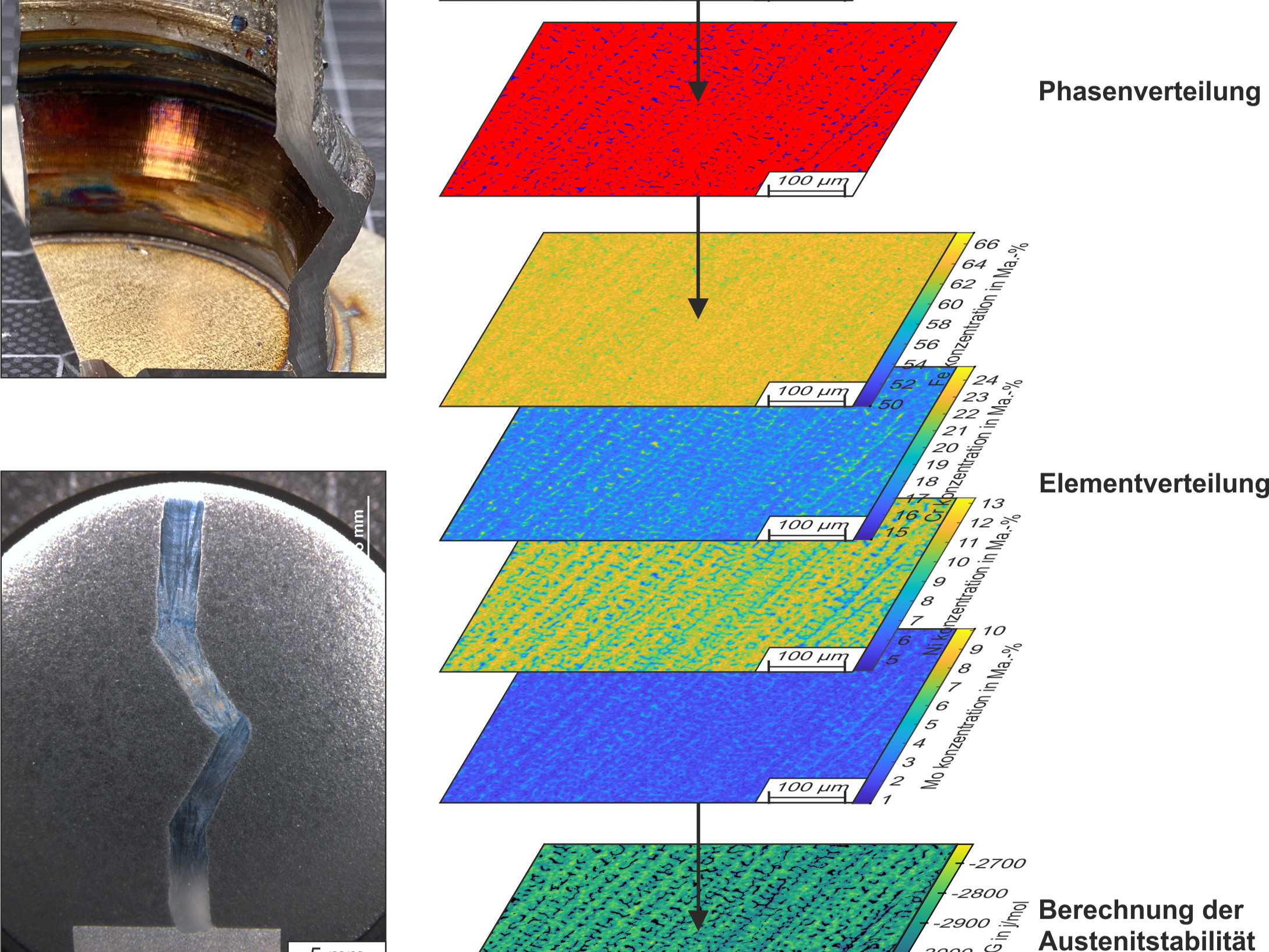 The Chair of Materials Technology is making a significant contribution to the research group, focusing in detail on microstructure formation and the microstructurally locally resolved thermodynamic stability of austenites that are to be used in H₂ environments in the future.